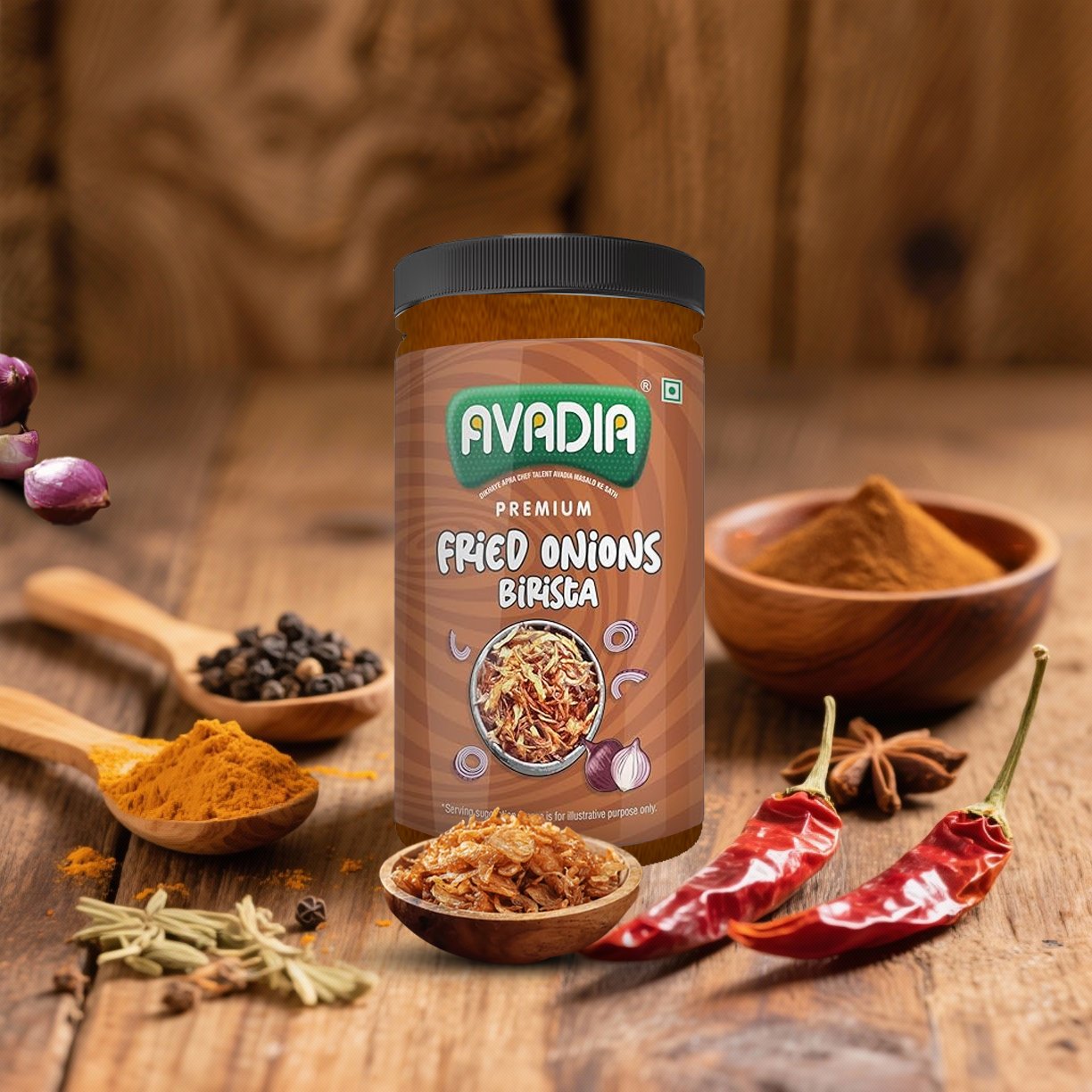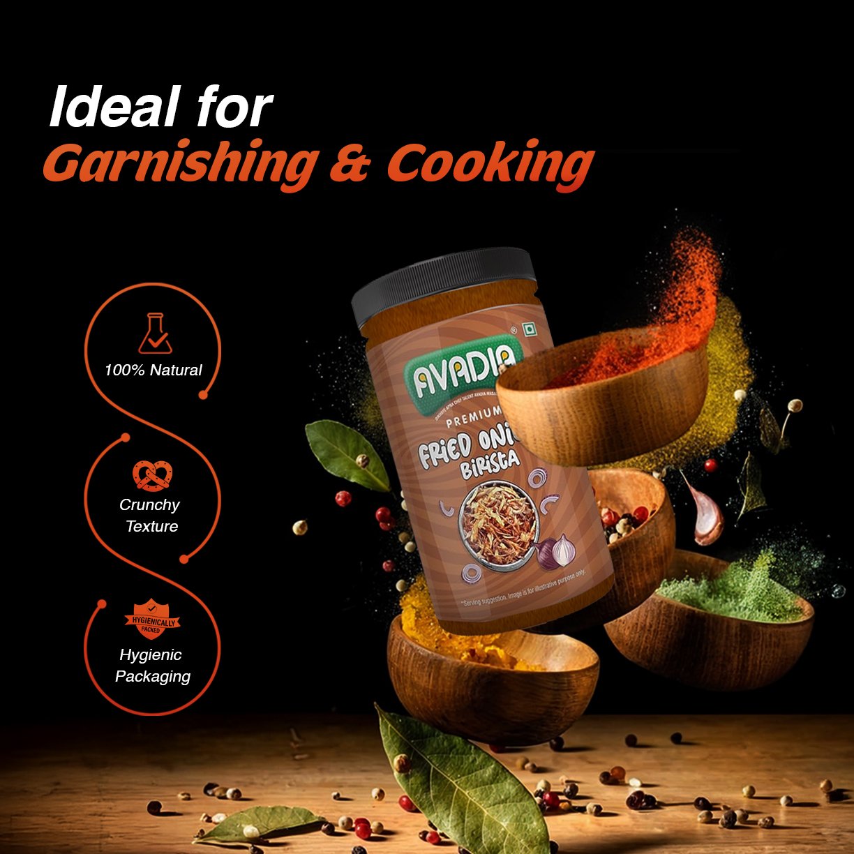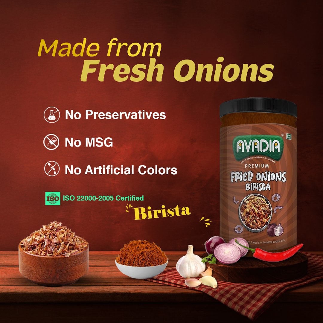 Avadia Fried Onion Birista offers golden, crispy fried onions made from fresh quality onions to enhance the flavor and texture of biryanis, curries, and snacks. This natural, preservative-free product adds a rich crunch and authentic taste to every dish. Packaged in a hygienic flip-top bottle, it retains crispness and freshness for longer use.