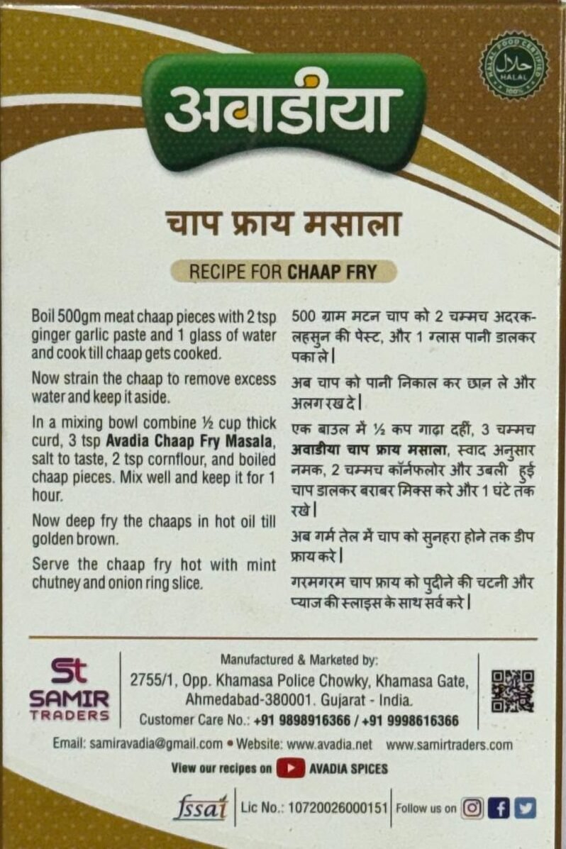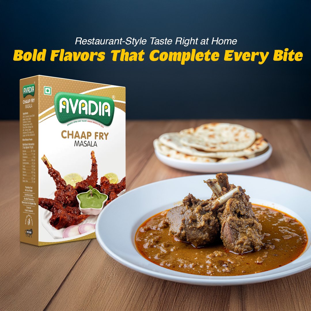 Avadia Chaap Fry Masala is crafted to bring authentic North Indian chaap flavors to your kitchen. This robust blend of coriander, cumin, fenugreek, garlic, dry mango, nutmeg, and mace delivers a bold, tangy, and aromatic taste, ideal for tandoori chaap, masala fry, or gravy-style dishes.Designed for marination or direct use in cooking, this masala infuses each bite with rich, street-style flavors.