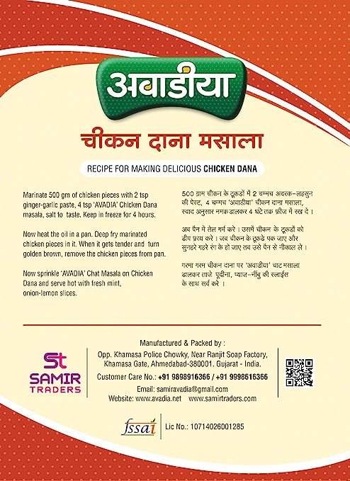 Avadia Chicken Dana Masala brings out bold, rustic flavor in dry and semi-gravy chicken dishes. A rich fusion of garlic, cumin, fenugreek leaves, cardamom, nutmeg, dry mango, and more—crafted without preservatives or artificial colors in an ISO 22000:2005 certified facility.