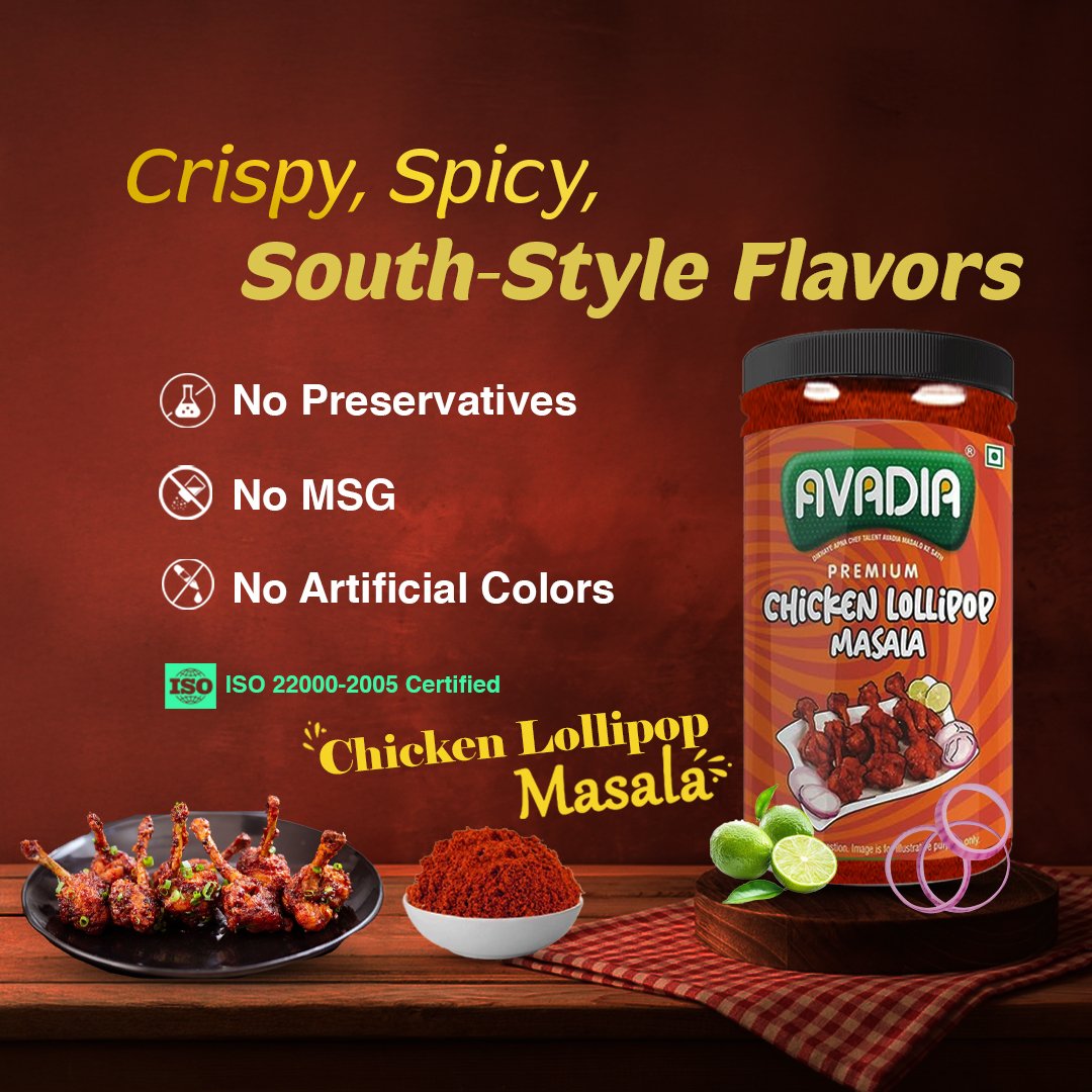 Avadia Chicken Lollipop Masala is a bold spice mix crafted for crispy fried or tossed chicken lollipops. Features dry mango, kasuri methi, star anise, nutmeg, and cumin. No artificial colors or preservatives. ISO 22000:2005 certified.