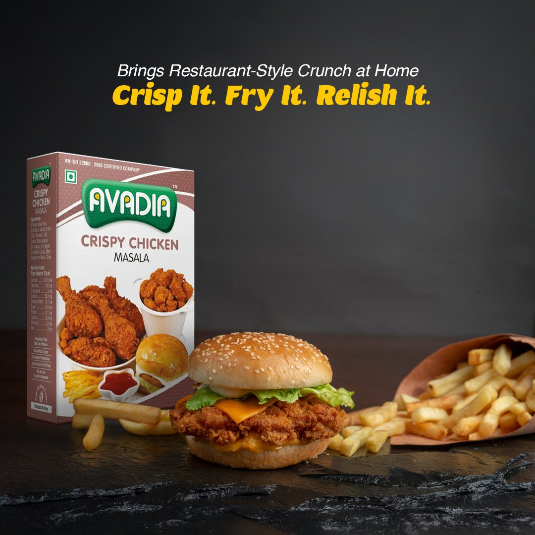 Avadia Crispy Chicken Masala is crafted for those who crave that perfect crunch and zesty flavor in every bite. A premium blend of refined wheat flour, corn flour, chili, cumin, dry mango, and aromatic spices, this coating mix gives your chicken a deliciously crispy texture with bold flavors.