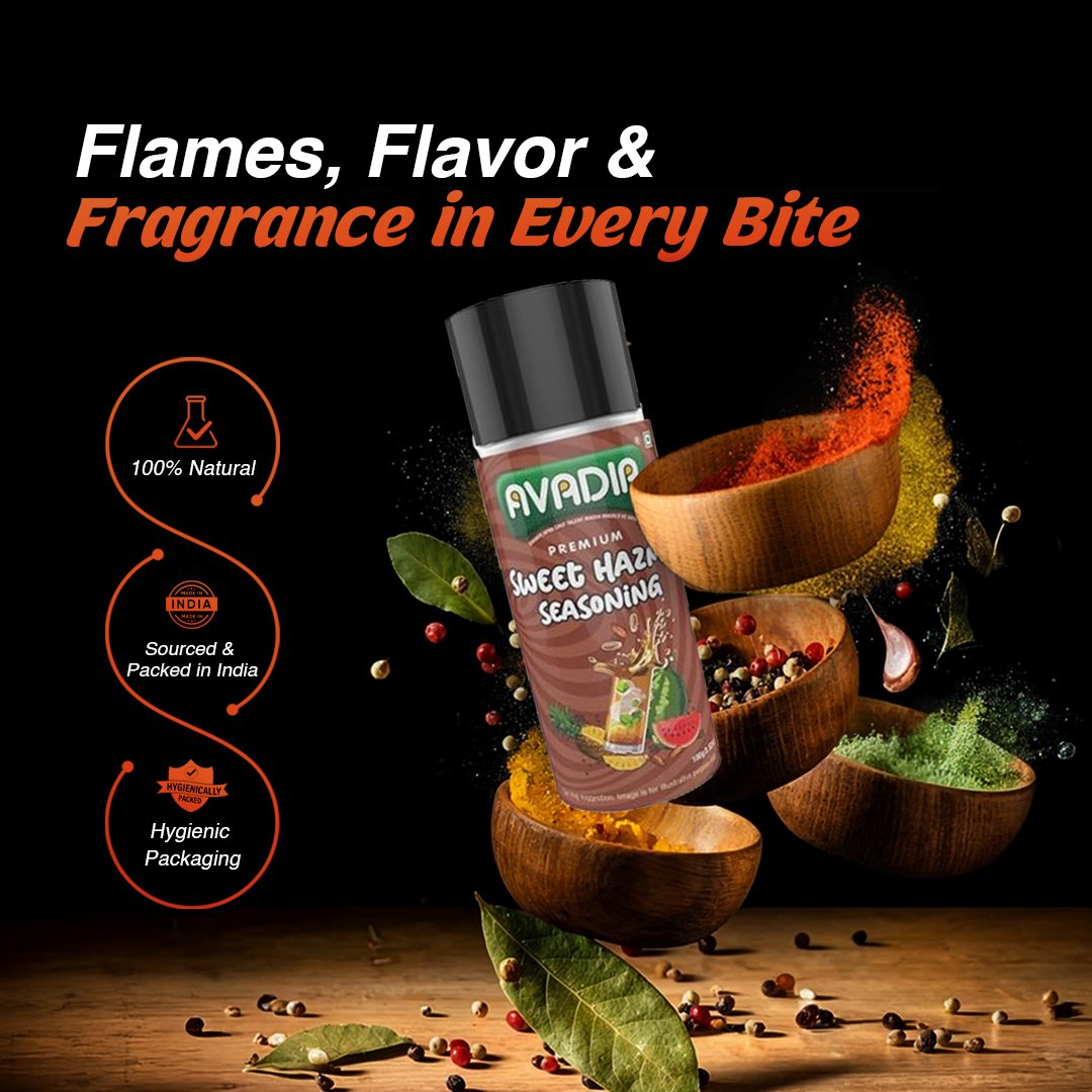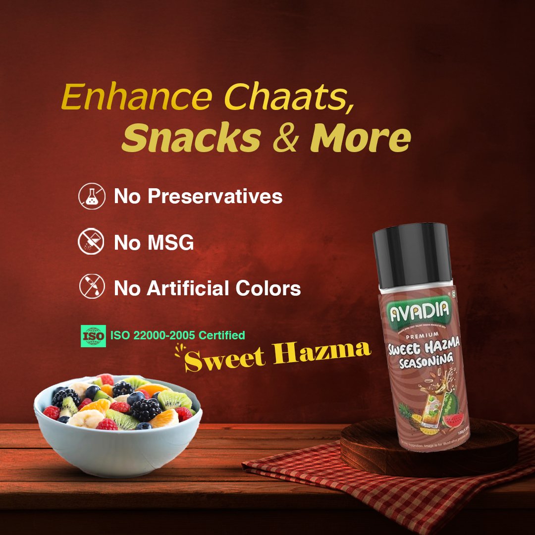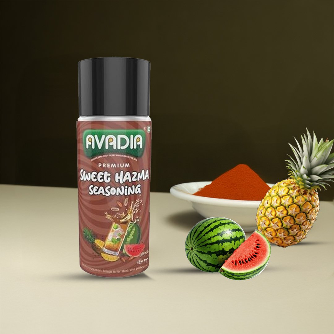 Avadia Hazma Seasoning is a premium blend of sweet dry dates, aromatic cumin, black pepper, and black salt, enriched with dry mango, coriander, and dry ginger. This flavorful mix elevates chaats and snacks with a balanced sweet-spicy profile. Free from preservatives and artificial colors, it’s a clean and natural choice for authentic taste.