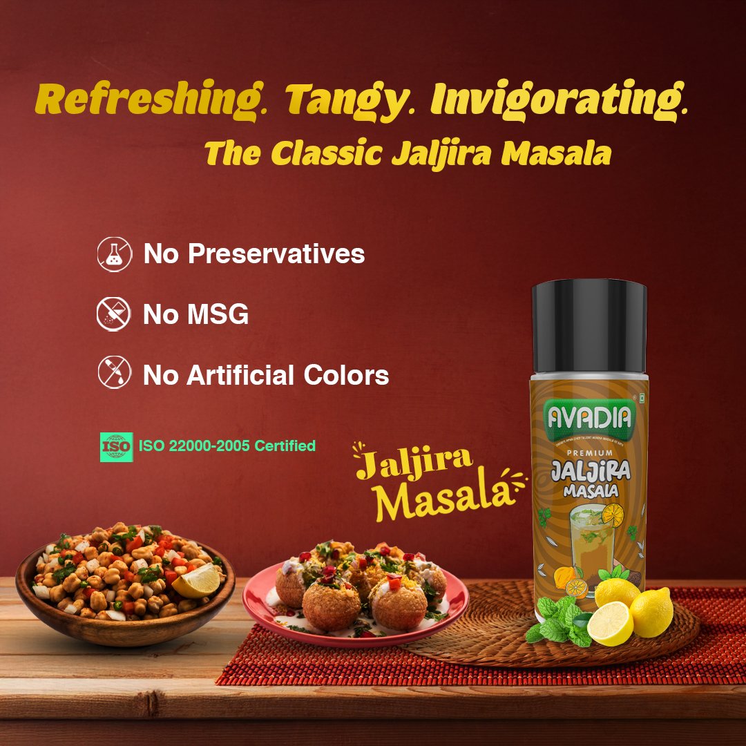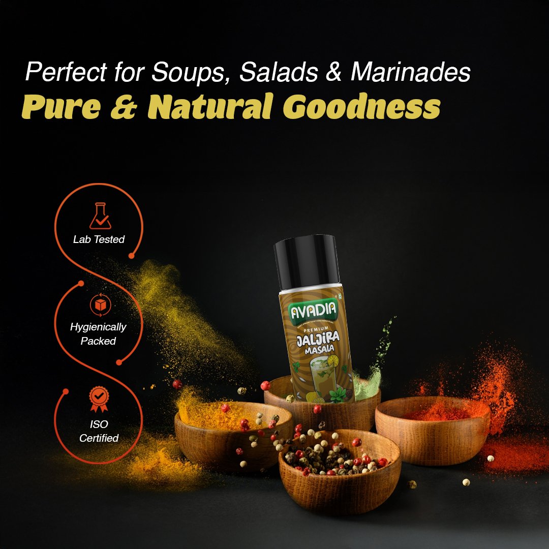 Avadia Jaljira Masala is a classic Indian spice blend combining tangy cumin, cooling mint, black salt, and aromatic spices like asafoetida and bishop weeds. This versatile seasoning enhances drinks, chaats, and snacks with its invigorating flavor profile. Free from preservatives and artificial colors, it offers a clean and authentic taste.