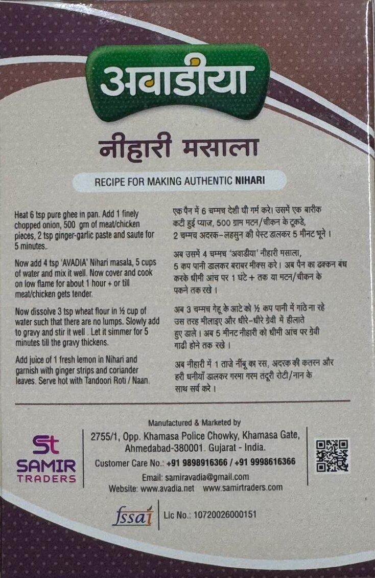 Avadia Nihari Masala brings the essence of traditional slow-cooked meat curries to your home. Carefully blended using coriander, black pepper, garlic, clove, cumin, dry ginger, fennel seeds, and bay leaf, this masala delivers deep flavor and warmth, layer by layer.Perfect for mutton or beef nihari, it creates rich, comforting gravies when slow-simmered for hours.