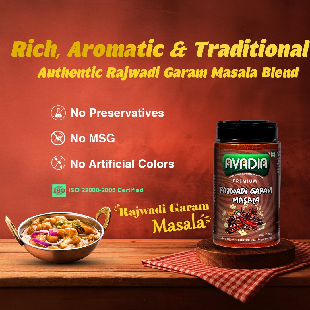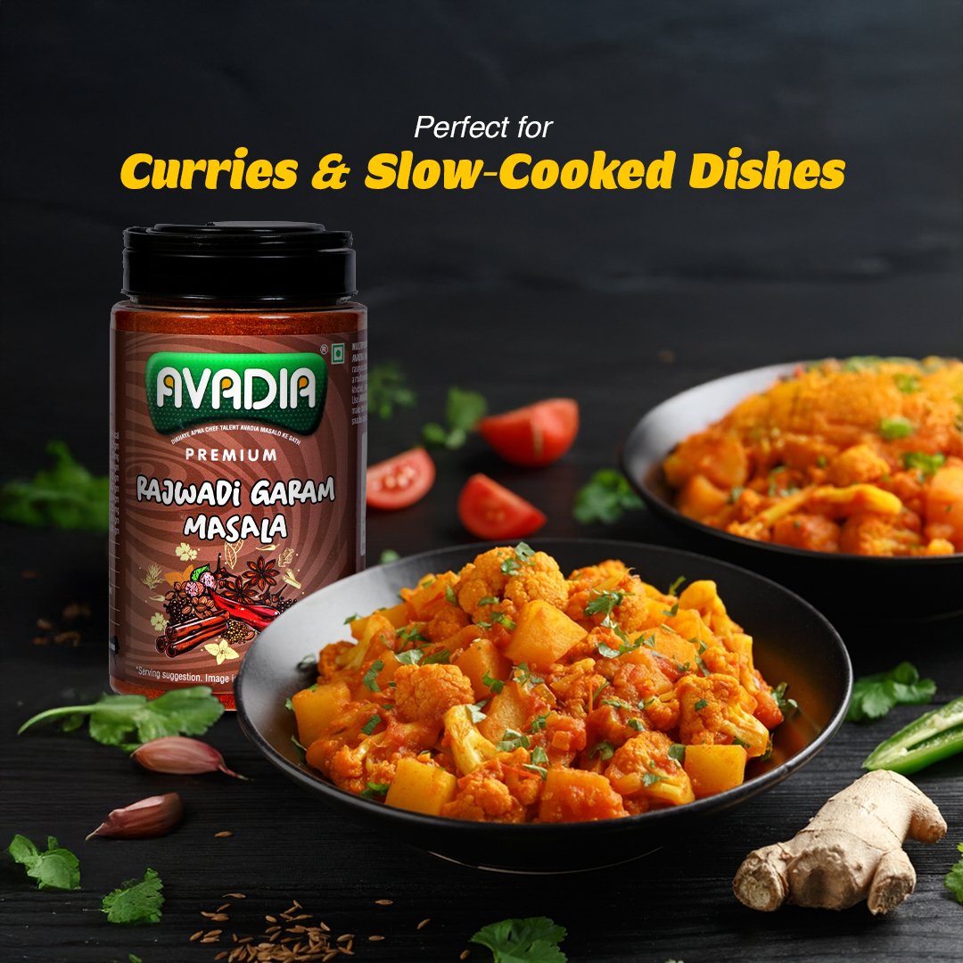 Avadia Rajwadi Garam Masala is an authentic, richly aromatic spice blend made from carefully selected whole spices like chili, coriander, star anise, cumin, and nutmeg. This traditional masala imparts bold and complex flavors, perfect for Indian curries, biryanis, and slow-cooked dishes. Free from artificial colors and preservatives, it guarantees purity, freshness, and lasting aroma in every use.