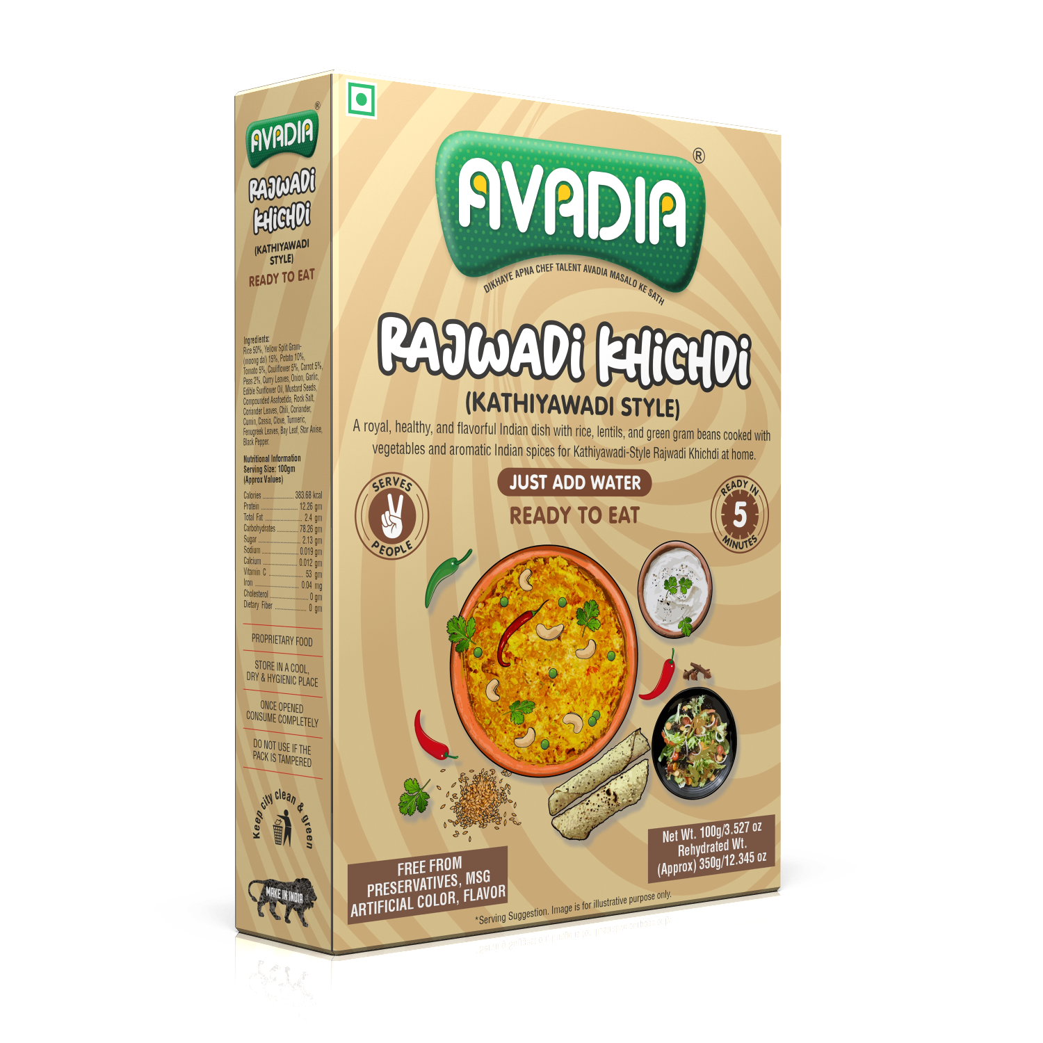 Savor the bold and comforting flavors of Gujarat with Avadia Rajwadi Khichdi – Kathiyawadi Style. Made with 50% rice, 15% yellow moong dal, and flavorful vegetables like potato, cauliflower, and tomato—this meal is spiced with mustard seeds, asafoetida, clove, bay leaf, and more.Perfectly seasoned and ready in just 5 minutes—simply add water and heat. Serves two people. A wholesome, satisfying option for quick meals, travel, or busy days—without preservatives, MSG, or artificial colors.
