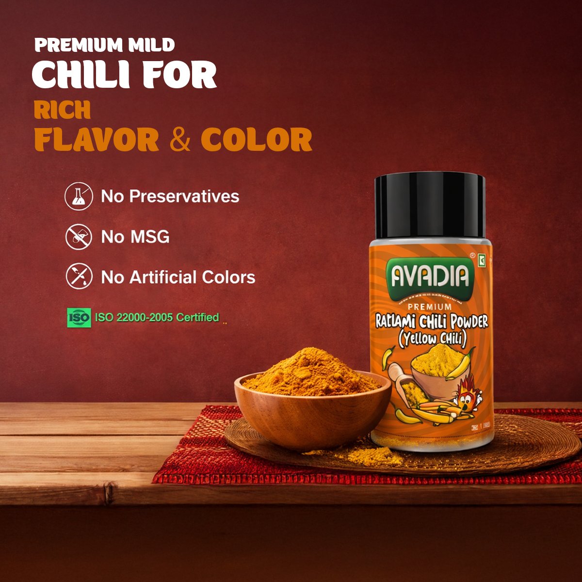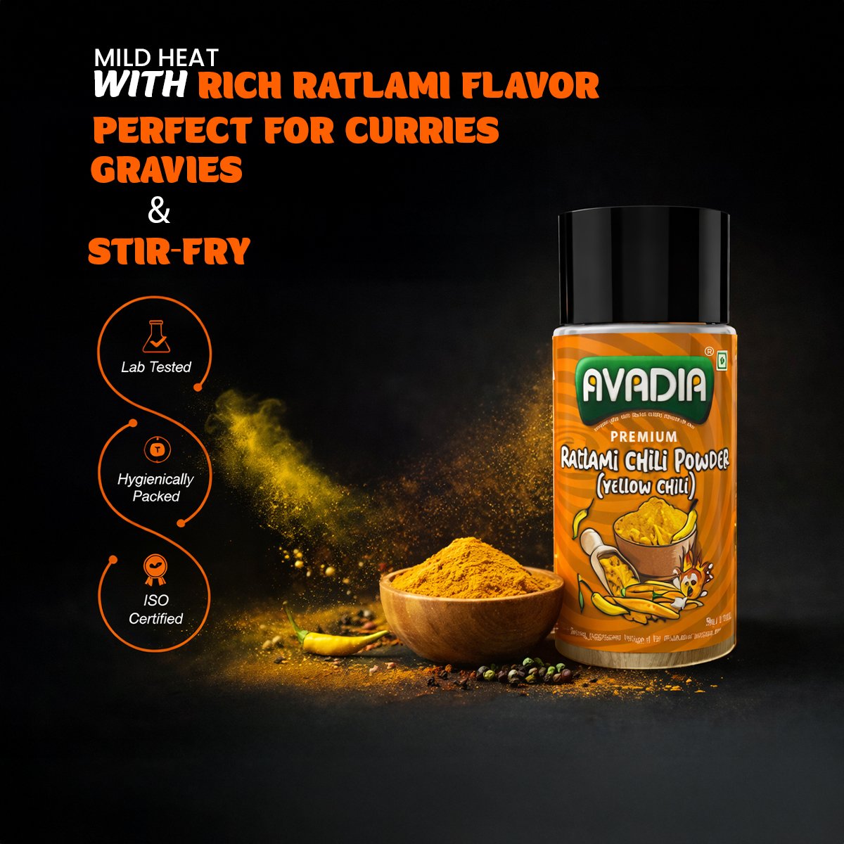 Avadia Ratlami Chili Powder (Yellow Chili) is crafted from premium-quality yellow chilies known for their bright color and distinctive Ratlami-style heat. This spice enhances poha, farsan, chaats, curries, and snack recipes with authentic flavor and aroma. Free from preservatives, MSG, and artificial colors, it ensures natural purity and consistent taste in every sprinkle. Hygienically packed to retain freshness, it is perfect for bringing traditional Ratlami flavor to everyday cooking.