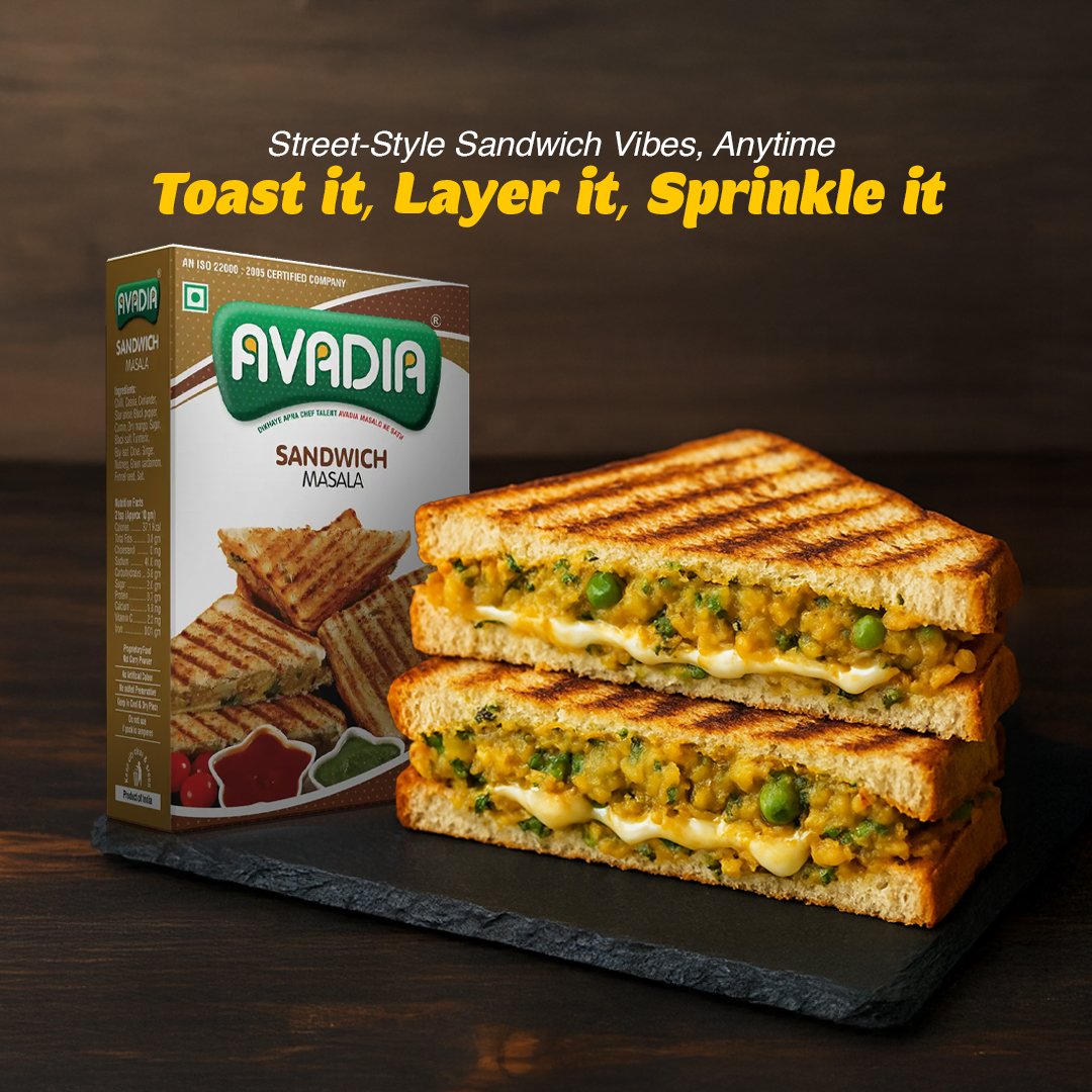 Avadia Sandwich Masala captures the street-style magic that turns an ordinary sandwich into a crave-worthy delight. Made from a rich mix of spices including coriander, black salt, cumin, dry mango, nutmeg, fennel, and clove, this masala delivers that sweet-tangy kick with warm undertones.